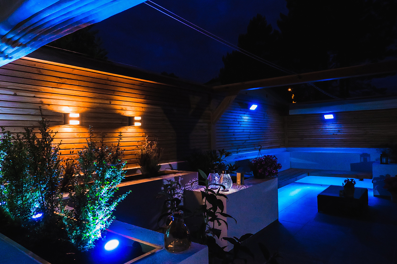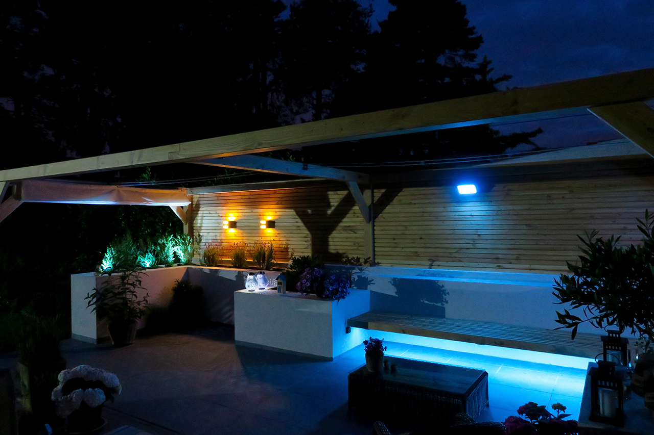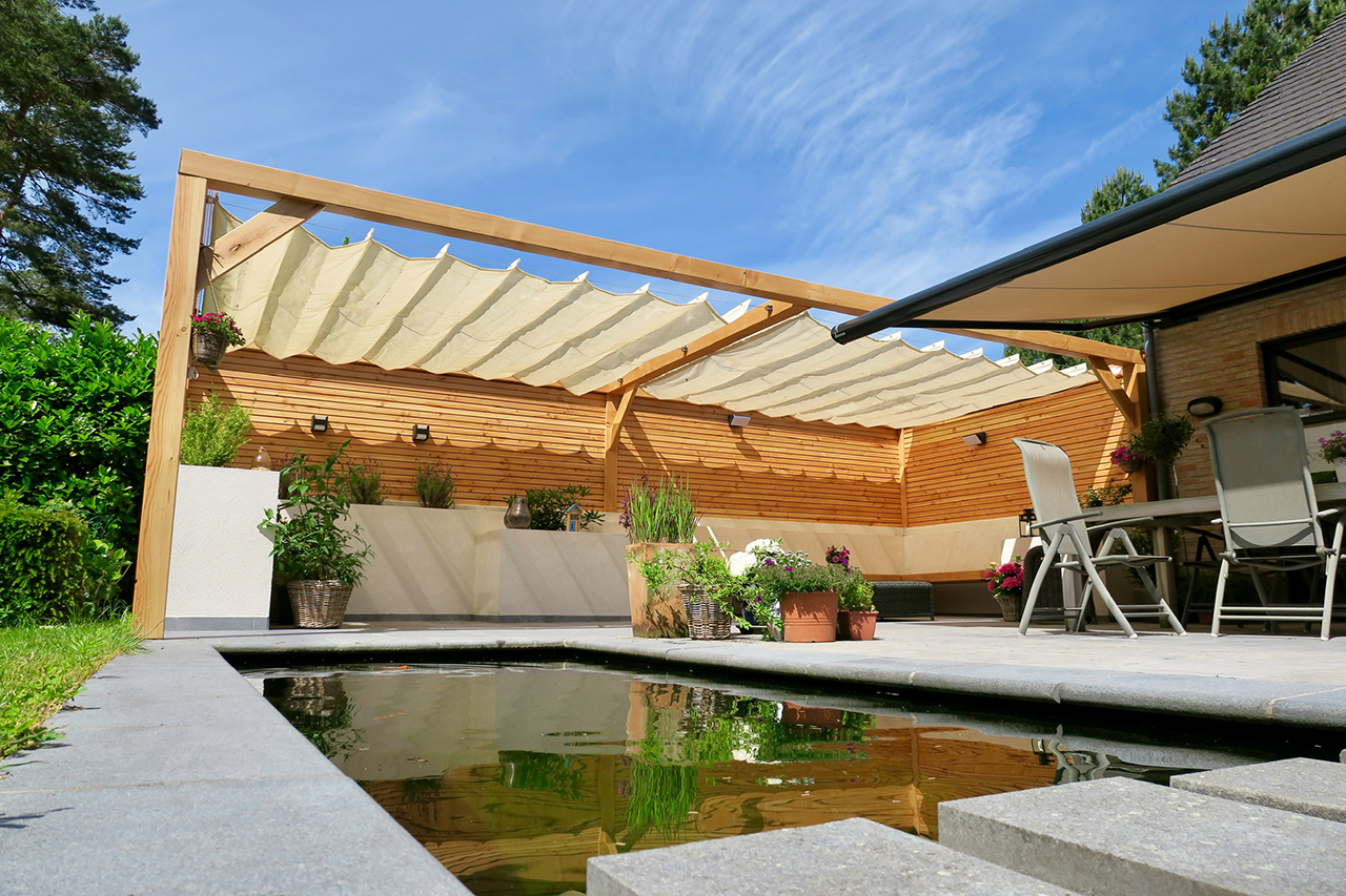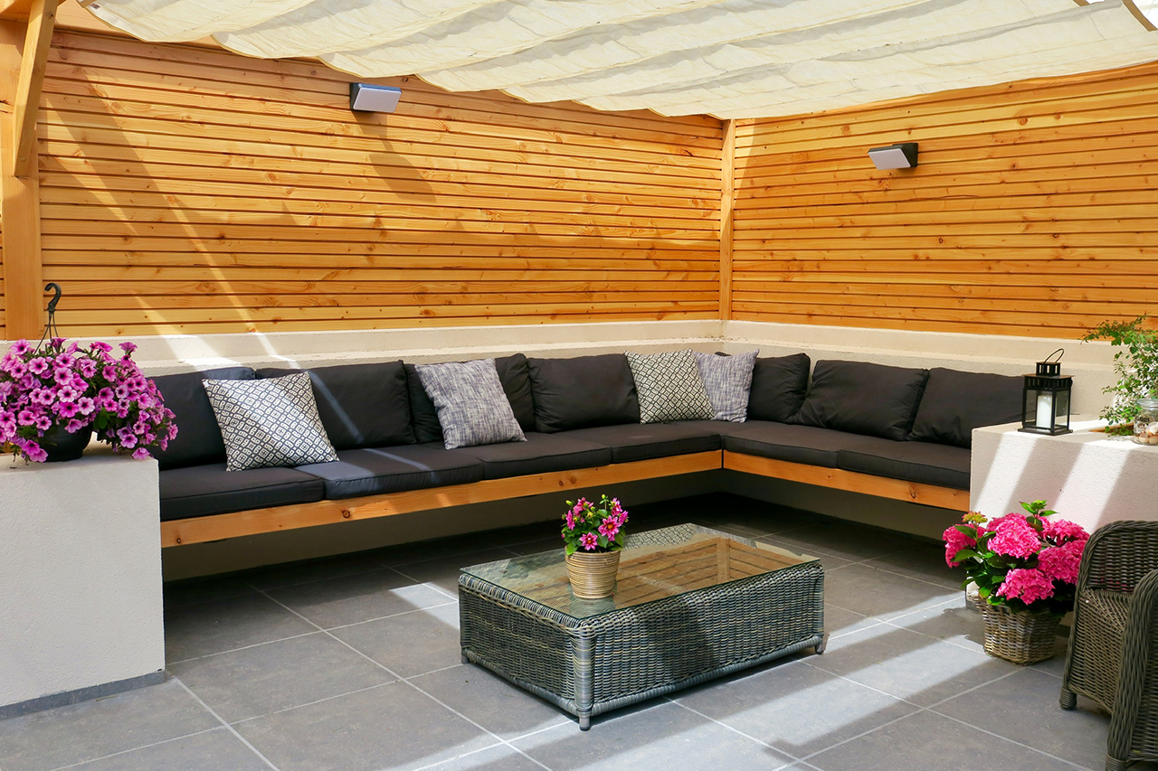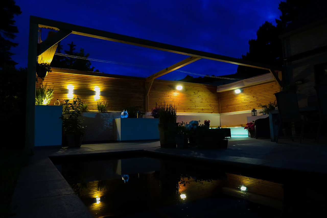 Deze klanten hechtten veel belang aan een mooie tuin, waar ze volledig tot rust konden komen.  Om die reden lieten ze al een vijver en terras aanleggen, maar er ontbrak nog iets.  Wij kregen dan ook de opdracht om een lounge te ontwerpen waar ze niet alleen konden ontspannen, maar ook energie opdoen.  Bij het maken van dit ontwerp hielden we uiteraard rekening met het terras en de vijver, om tot een mooi geheel te komen. VTkamerontwerp stond niet alleen in voor het ontwerp, maar eveneens voor de volledige uitvoering; zijnde de houten constructie, het plaatsen van de tegels, het bijbehorend metselwerk en het voorzien van de nodige elektriciteit, zitbanken en zonnewering.  De buitenoppervlakte wordt nu optimaal benut en zorgt ervoor dat het zowel overdag als ’s avonds – met of zonder het gezelschap van vrienden - aangenaam vertoeven is in de tuin.