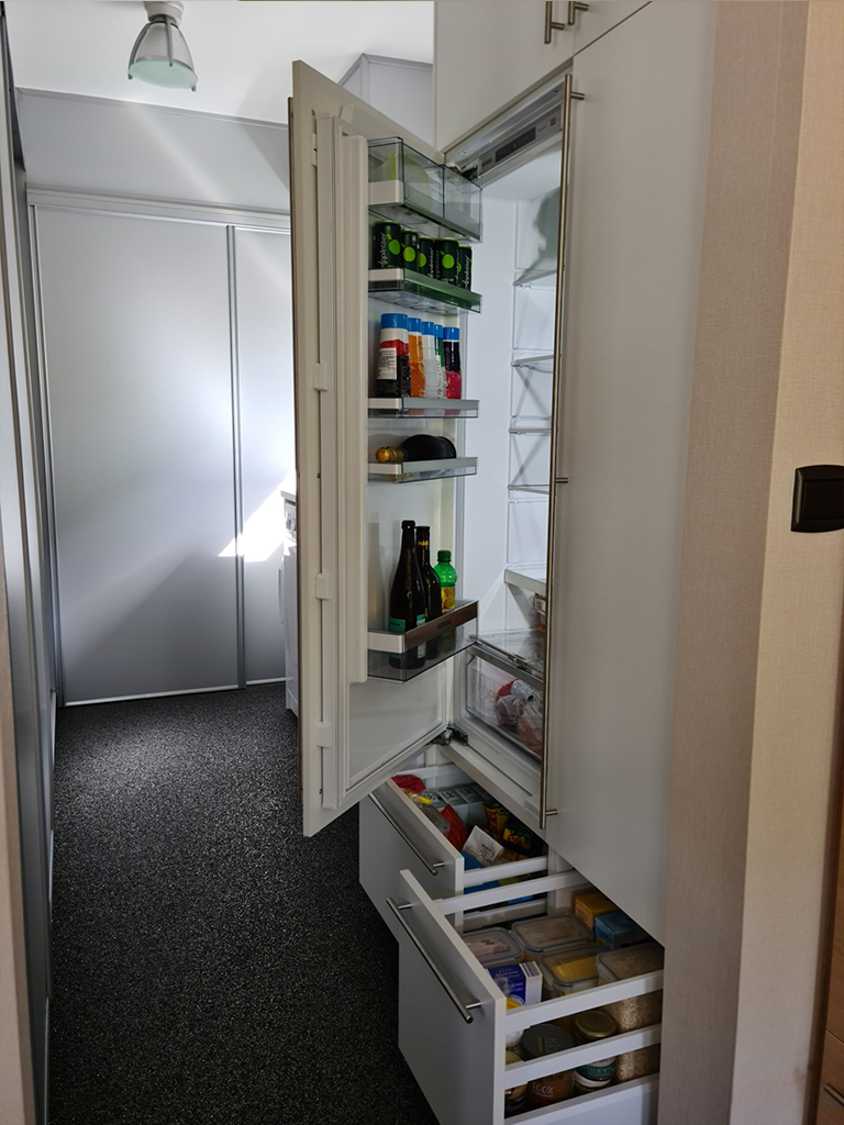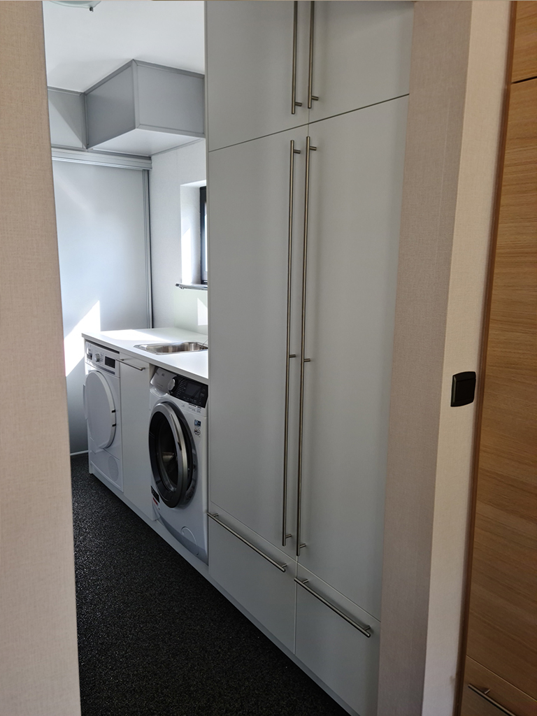 Ondanks het feit dat de wasplaats toch een belangrijke ruimte van een woning is, is het inrichten ervan zelden een prioriteit. Zonder de nodige opbergruimte en inrichting kan een wasplaats bovendien snel een slordige ruimte worden. VTkamerontwerp zorgde voor slimme oplossingen voor de inrichting van de wasplaats van dit gezin. Het ontwerp omvatte een doeltreffende indeling met extra aandacht voor voldoende bergruimte. Er werd een opbergmeubel (op maat) gemaakt waarin de wasmachine, droogkast en koelkast geïntegreerd werden. Op vraag van de klant werd in deze wasplaats ook een wastafel geplaatst. De wastafel werd voorzien van een diepere spoelbak met hogere mengkraan, die het vullen van emmers gemakkelijker maakt. De spatwand houdt alles proper, zelfs bij vuile karweitjes.