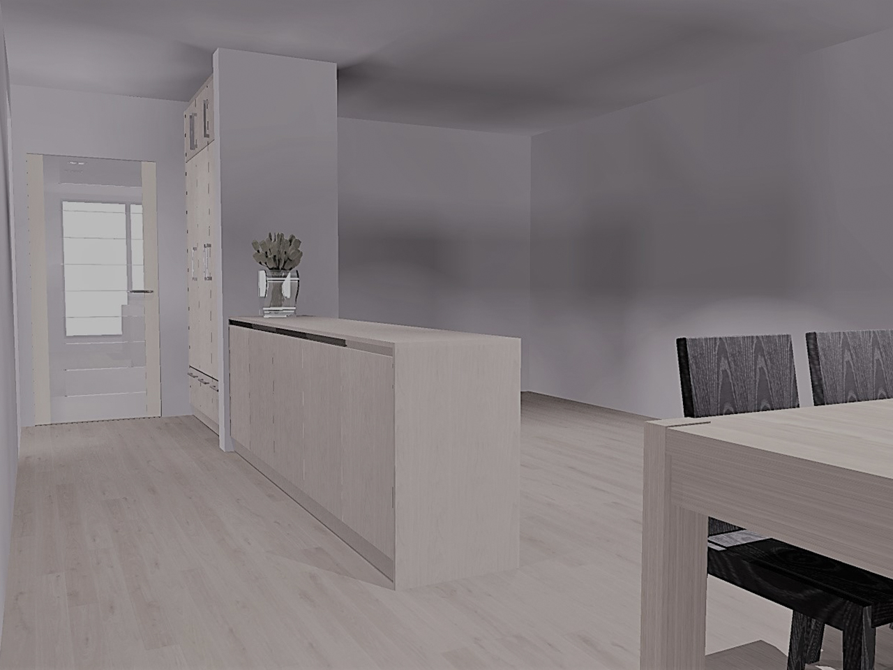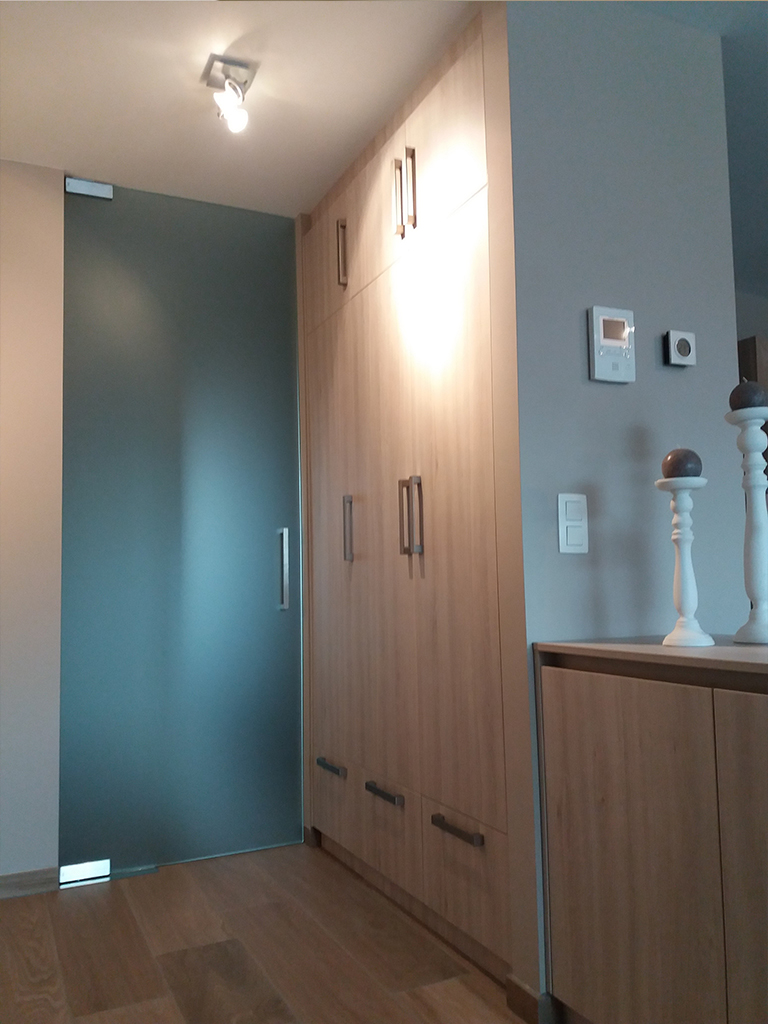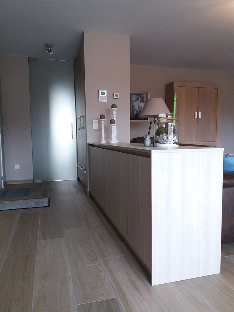 Door het plaatsen van een roomdivider kwam VTkamerontwerp tegemoet aan de vraag om zowel een aparte ontvangstruimte als extra opbergmogelijkheden te voorzien.  Door de roomdivider werden de ontvangstruimte en leefruimte van elkaar gescheiden, zonder afbreuk te doen aan het ruimtelijk en open gevoel.