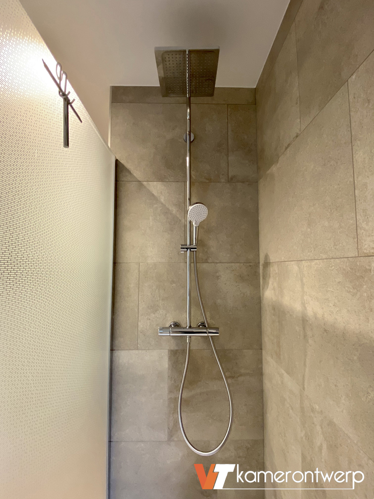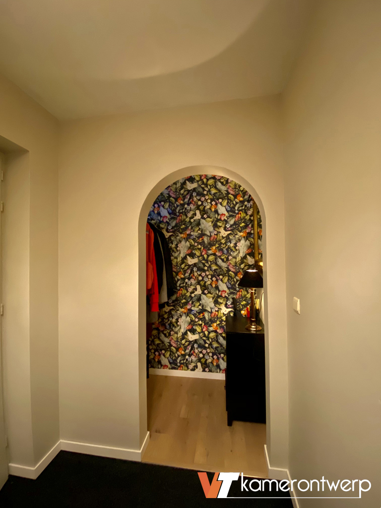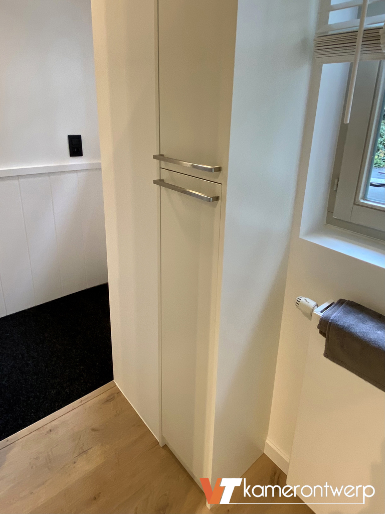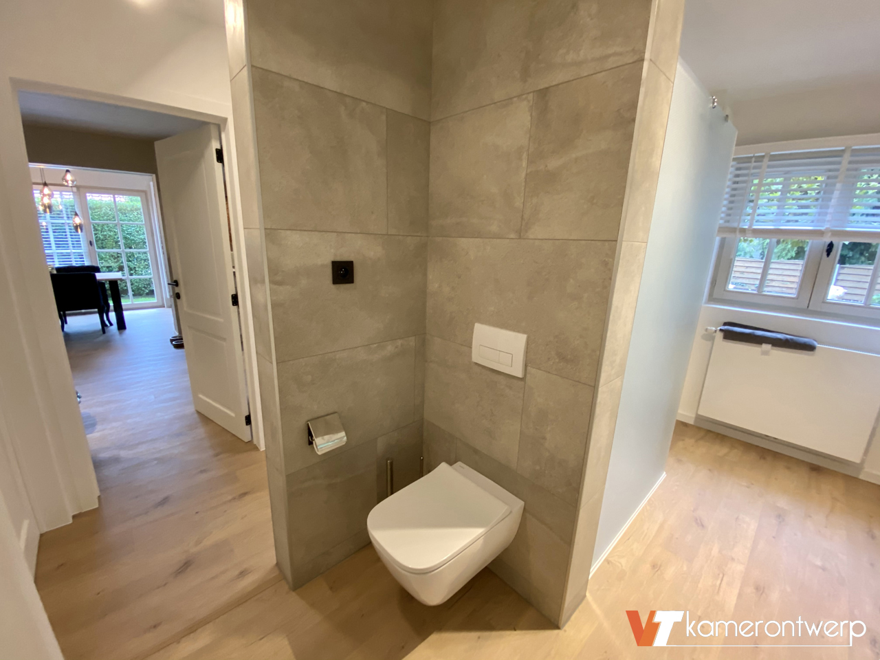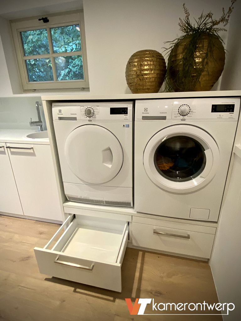 De klant wou vooral een praktische, maar ook een mooie berging mét sanitaire voorzieningen.  VTkamerontwerp zorgde voor een kast, waarin zowel de wasmachine als de droogkast geplaatst werden.  We voorzagen ook een opbergruimte voor de strijkplank.  Verder werden in de berging een inloopdouche, nieuw toilet en een strak aanrecht met lavabo geplaatst.  In de aanpalende gang plaatsten we een nieuwe lambrisering.  Zowel het sanitair als de elektriciteit werden door ons aangepast.  VTkamerontwerp stond ook in voor de nodige bezettings- en schilderwerken.