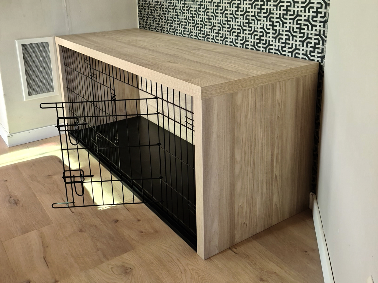 Wat dus startte met de renovatie van de berging werd een totaalproject van de benedenverdieping, met als sluitstuk een op maatgemaakte hondenbench voor hun geliefde viervoeter.