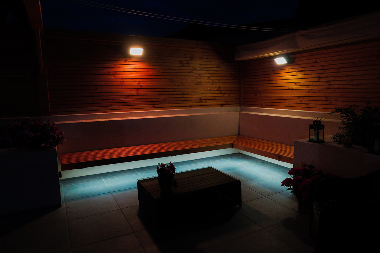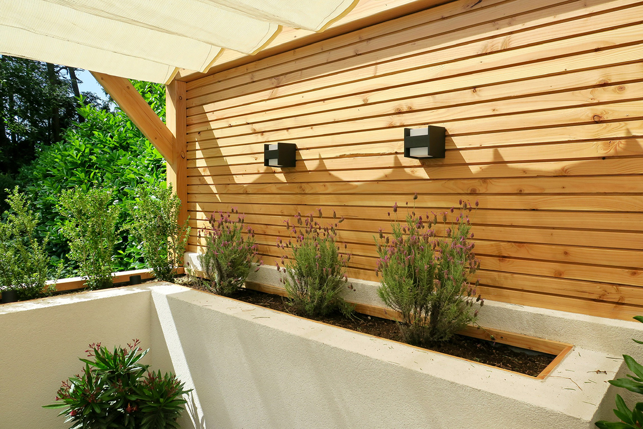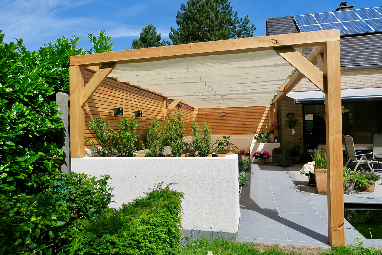 Deze klanten hechtten veel belang aan een mooie tuin, waar ze volledig tot rust konden komen.  Om die reden lieten ze al een vijver en terras aanleggen, maar er ontbrak nog iets.  Wij kregen dan ook de opdracht om een lounge te ontwerpen waar ze niet alleen konden ontspannen, maar ook energie opdoen.  Bij het maken van dit ontwerp hielden we uiteraard rekening met het terras en de vijver, om tot een mooi geheel te komen. VTkamerontwerp stond niet alleen in voor het ontwerp, maar eveneens voor de volledige uitvoering; zijnde de houten constructie, het plaatsen van de tegels, het bijbehorend metselwerk en het voorzien van de nodige elektriciteit, zitbanken en zonnewering.  De buitenoppervlakte wordt nu optimaal benut en zorgt ervoor dat het zowel overdag als ’s avonds – met of zonder het gezelschap van vrienden - aangenaam vertoeven is in de tuin.