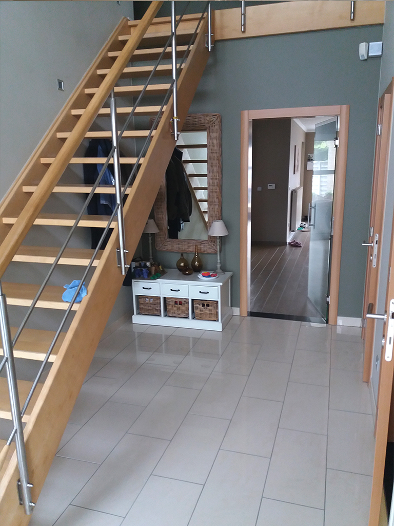 Tot slot werd ook de volledige trap onder handen genomen. Hij kreeg niet alleen een nieuw laagje verf, maar ook tredecovers. In deze traphal werd dus niet alleen de ‘verloren’ ruimte optimaal ingevuld; door het gebruik van de juiste materialen werd de ruimte niet alleen ‘opengetrokken’, maar heeft deze nu ook een moderne en frisse uitstraling.