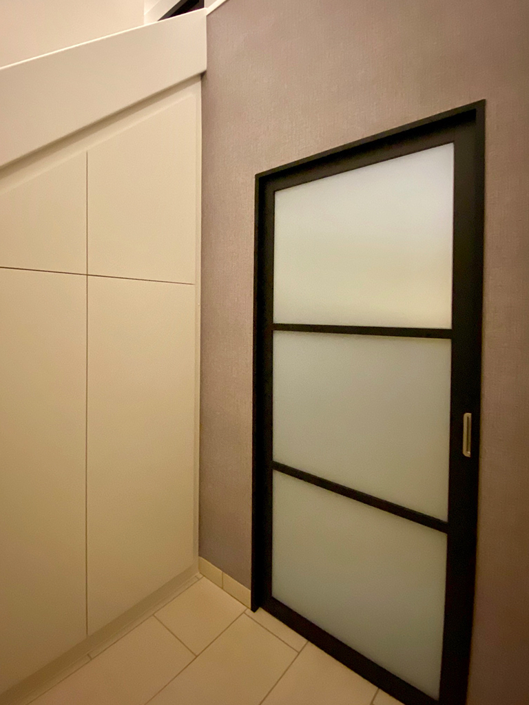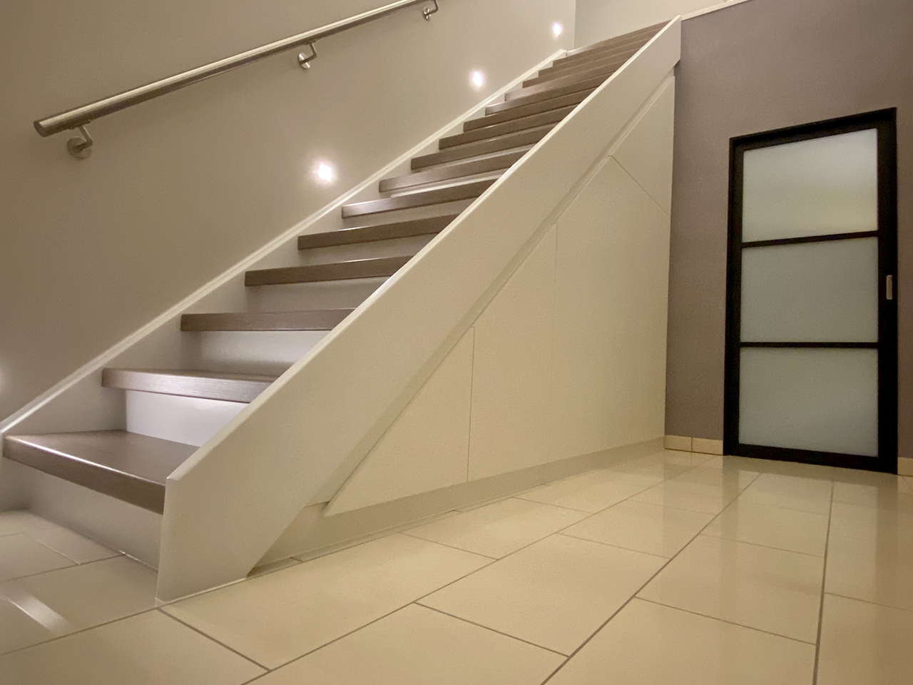 Onder een trap ontstaat vaak een nutteloze ruimte. Dat is erg jammer. Om de ruimte onder deze trap optimaal te benutten en in te richten, ontwierp VTkamerontwerp voor deze klant enkele maatkasten. Het was tevens de wens van de klant om deze ruimte een moderne look te geven. Het gebruik van ‘greeploze’ kastfronten, in combinatie met een nieuwe inox muurleuning, zorgen voor een strak geheel. Verder werd de traditionele, klassieke deur vervangen door een schuifdeur, die volledig werd ingewerkt in een voorzetwand.