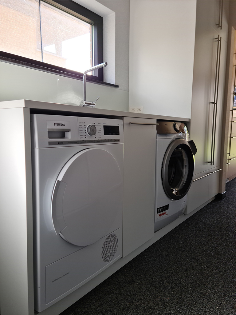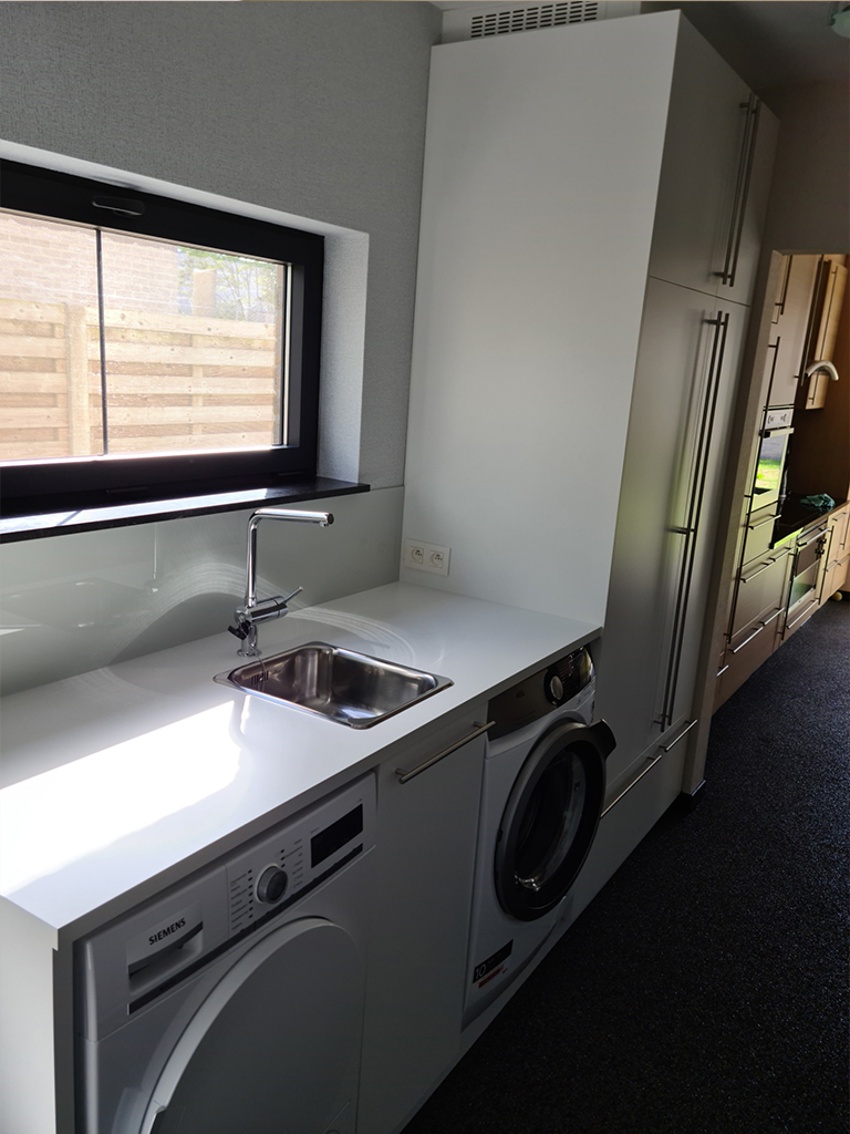 Ondanks het feit dat de wasplaats toch een belangrijke ruimte van een woning is, is het inrichten ervan zelden een prioriteit. Zonder de nodige opbergruimte en inrichting kan een wasplaats bovendien snel een slordige ruimte worden. VTkamerontwerp zorgde voor slimme oplossingen voor de inrichting van de wasplaats van dit gezin. Het ontwerp omvatte een doeltreffende indeling met extra aandacht voor voldoende bergruimte. Er werd een opbergmeubel (op maat) gemaakt waarin de wasmachine, droogkast en koelkast geïntegreerd werden. Op vraag van de klant werd in deze wasplaats ook een wastafel geplaatst. De wastafel werd voorzien van een diepere spoelbak met hogere mengkraan, die het vullen van emmers gemakkelijker maakt. De spatwand houdt alles proper, zelfs bij vuile karweitjes.