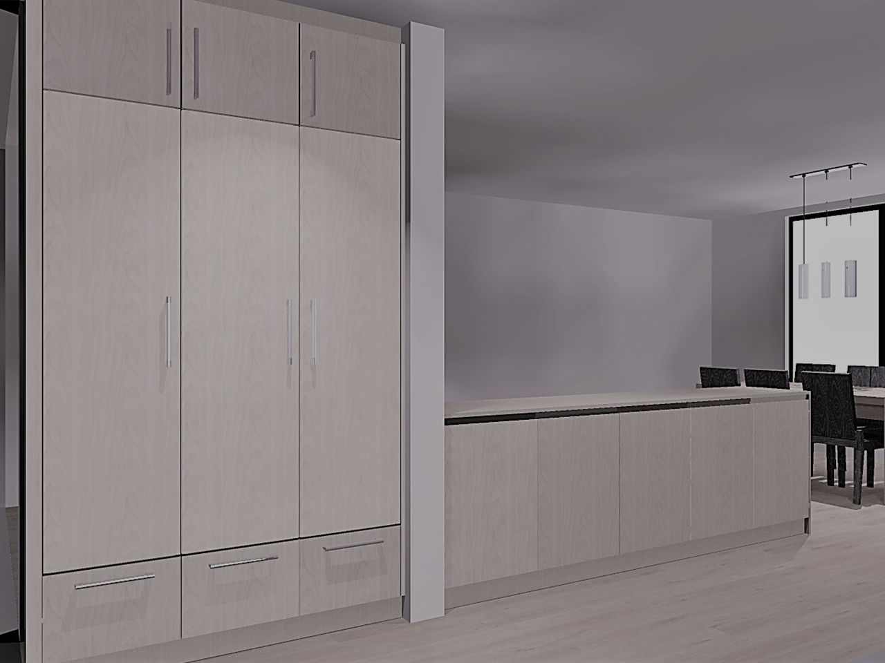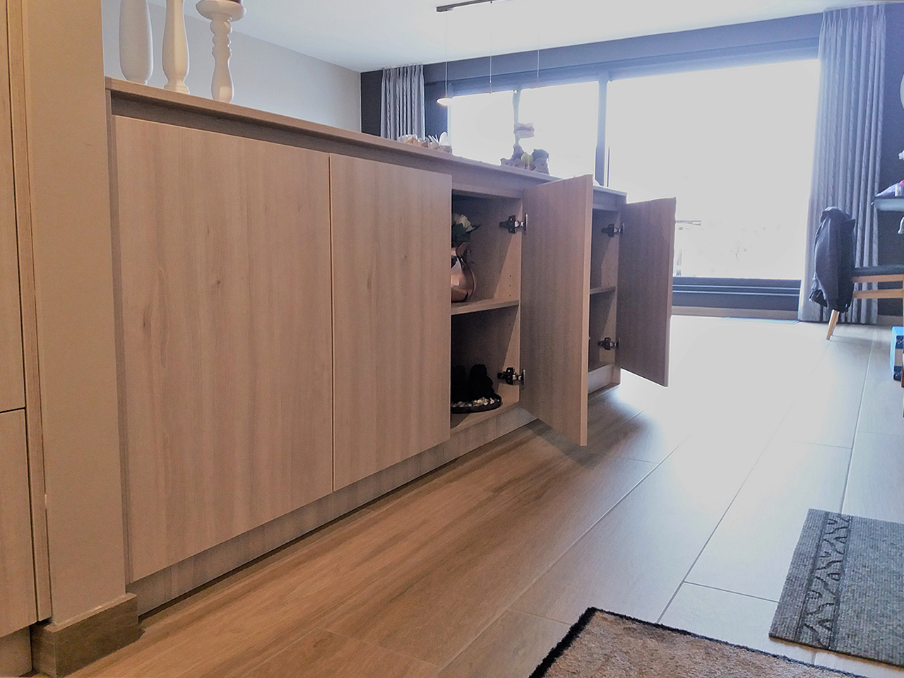 De ontvangstruimte werd voorzien van hoge maatkasten, met plaats voor jassen en schoenen. De roomdivider - uitgewerkt met lage, greeploze dressoirkasten - biedt extra opbergruimte.