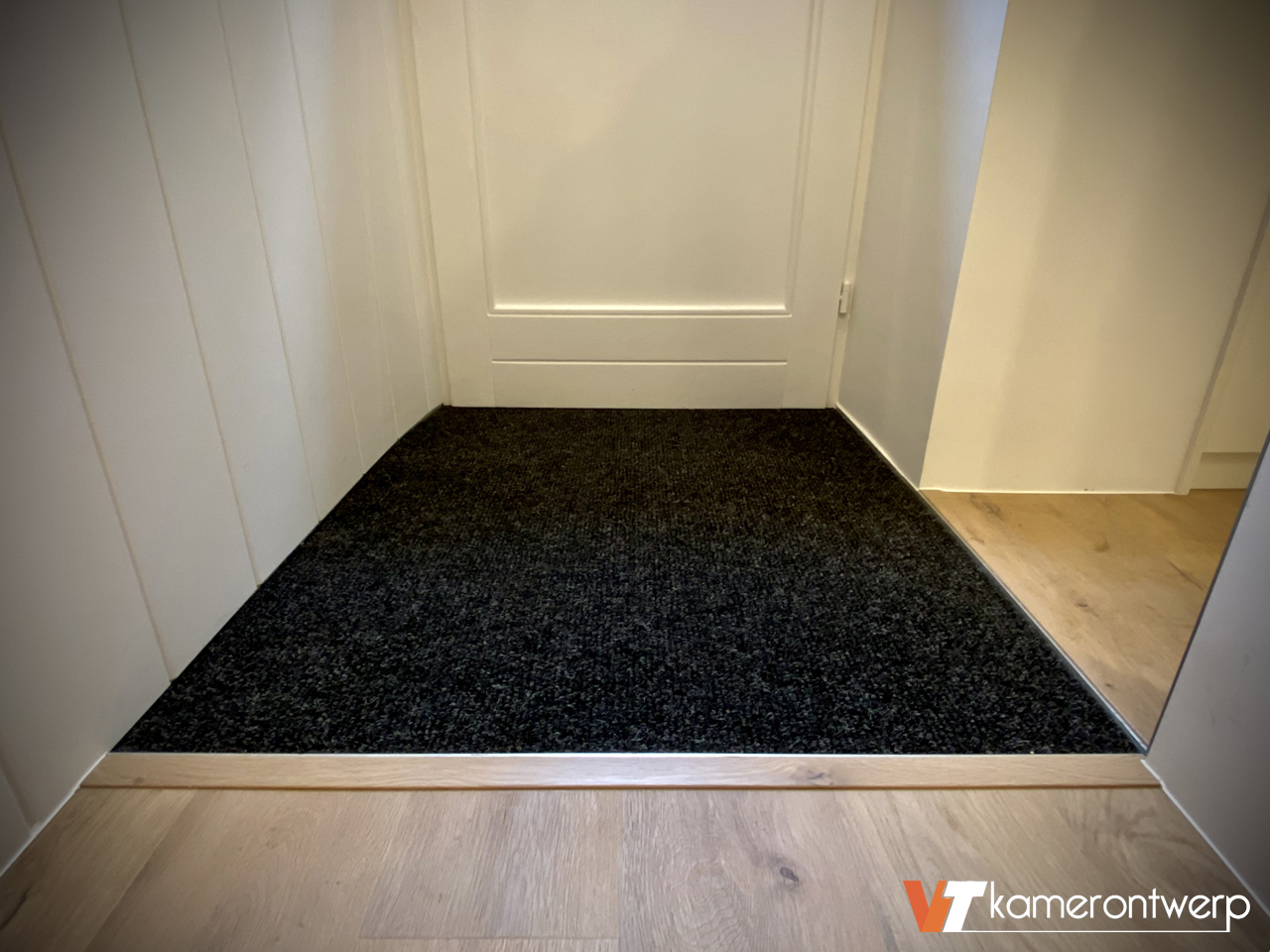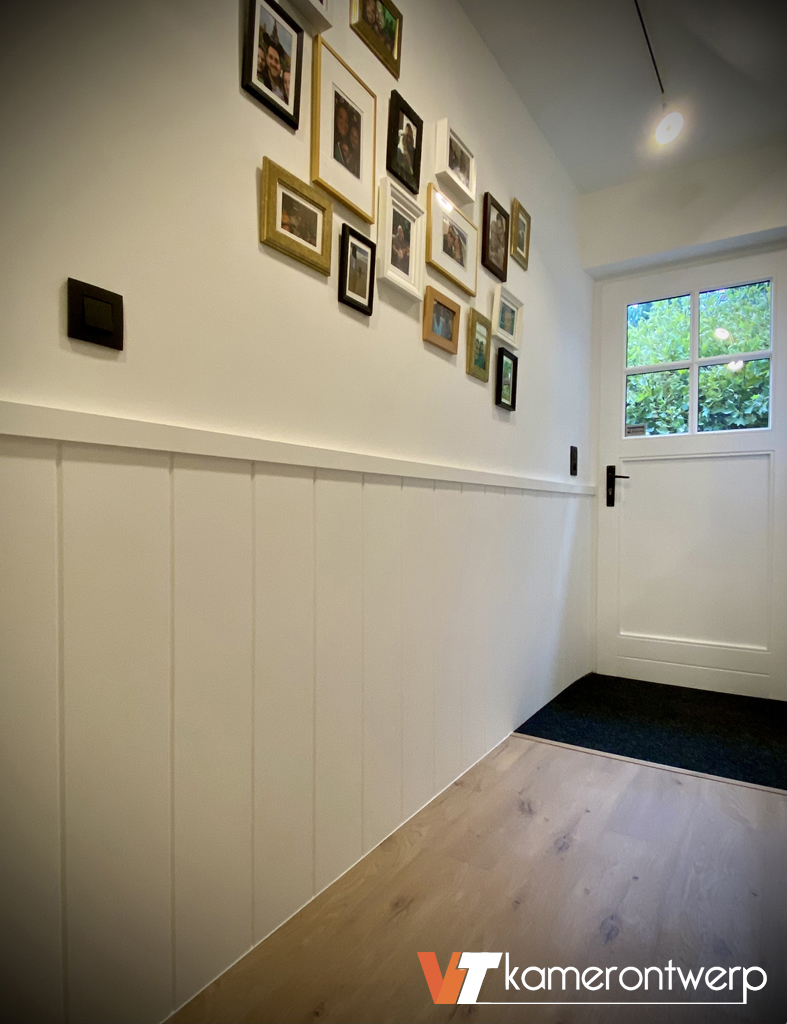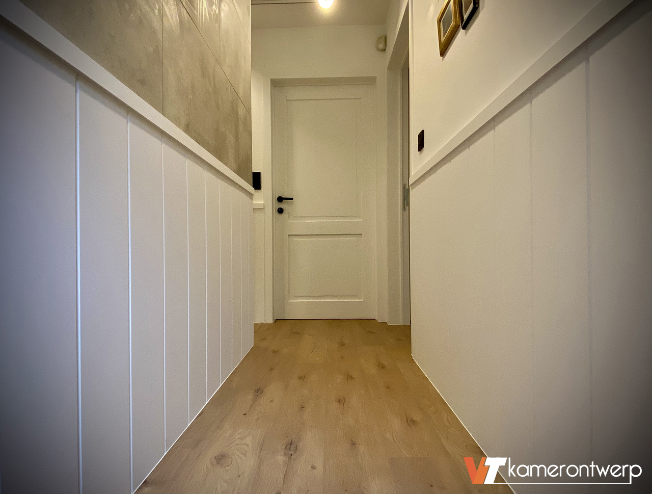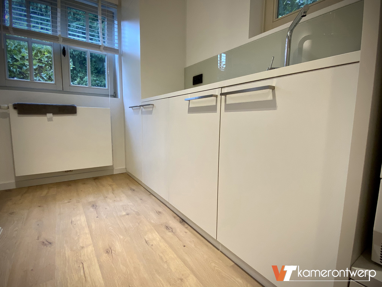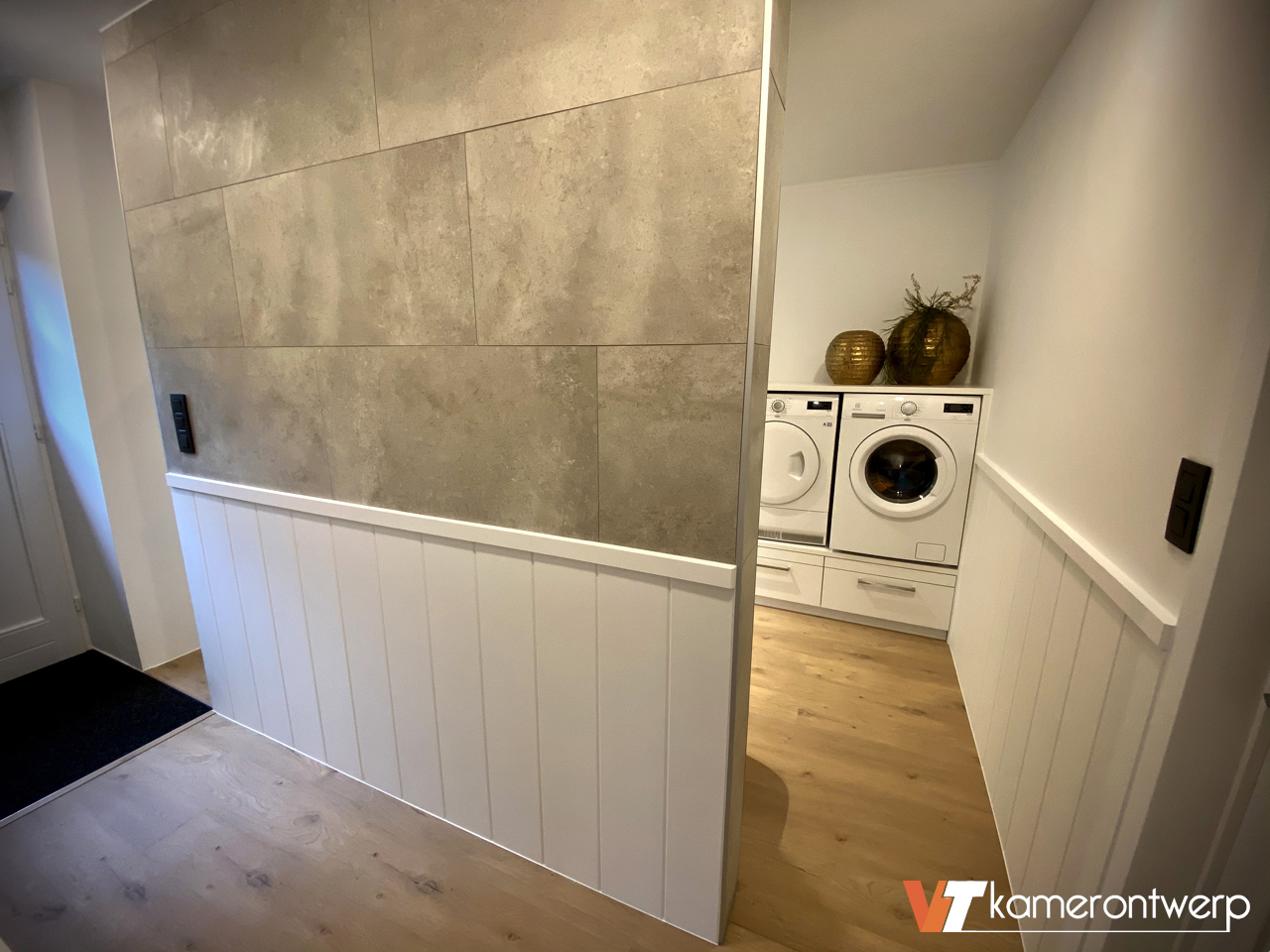 De klant wou vooral een praktische, maar ook een mooie berging mét sanitaire voorzieningen.  VTkamerontwerp zorgde voor een kast, waarin zowel de wasmachine als de droogkast geplaatst werden.  We voorzagen ook een opbergruimte voor de strijkplank.  Verder werden in de berging een inloopdouche, nieuw toilet en een strak aanrecht met lavabo geplaatst.  In de aanpalende gang plaatsten we een nieuwe lambrisering.  Zowel het sanitair als de elektriciteit werden door ons aangepast.  VTkamerontwerp stond ook in voor de nodige bezettings- en schilderwerken.