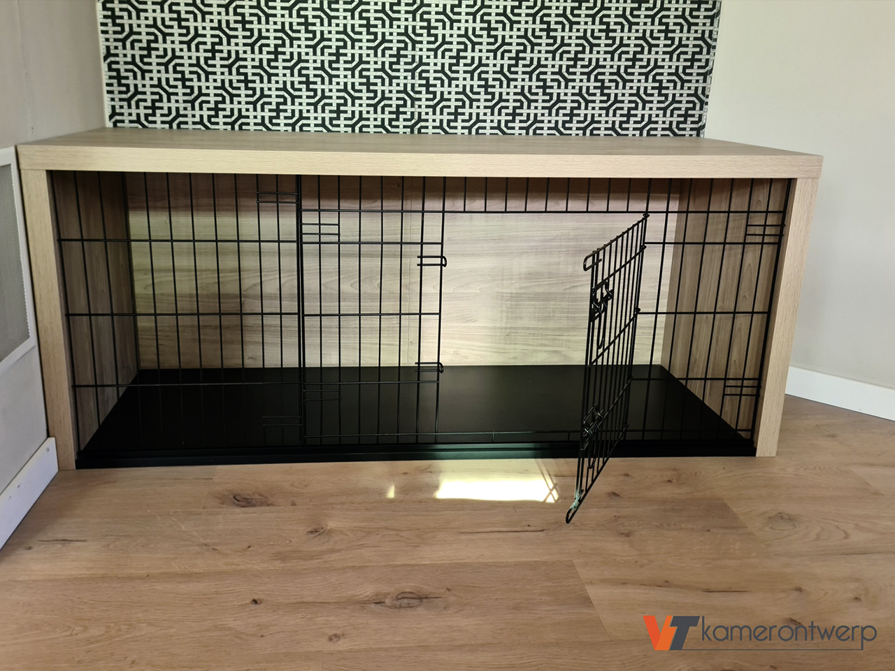 Wat dus startte met de renovatie van de berging werd een totaalproject van de benedenverdieping, met als sluitstuk een op maatgemaakte hondenbench voor hun geliefde viervoeter.